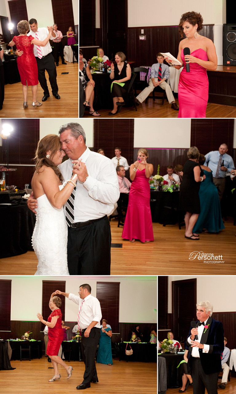They got married at the Palmer Building. The clouds held out just long enough for us to enjoy the beautiful ceremony and for us to have enough time for outdoor portraits. Everyone involved was so easy to work with, and just a blast! I loved Kristin’s choice of colors, green and hot pink. And the groomsmen’s ties…how cool are they?! Their reception was filled with heartfelt speeches, fond memories, and of course, an awesome dance party lead by DJ Todd Alexander of Spintastic Sounds.