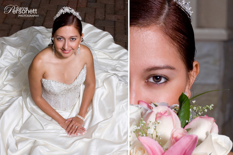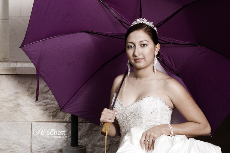 Downtown Charlotte – Despite the continued downpour, Kathy kept her spirits up and made SUCH a beautiful bride! I especially love this first photo of Kathy, against the wall of the Bechtler Museum; she looks so exotic!